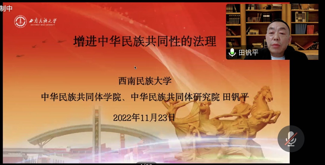 为深入学习二十大精神,增进铸牢中华民族共同体意识的理论认知和学理阐释,2022年11月23日,民族法党支部组织“二十大精神”系列讲座之《增进中华民族共同性的法理探析》。本次讲座特邀西南民族大学中华民族共同体学院副院长田钒平教授主讲,动画疯 副院长、民族宗教研究院院长宋海彬教授主持,民族法党支部全体教师及校内外广大师生一百余人参加。