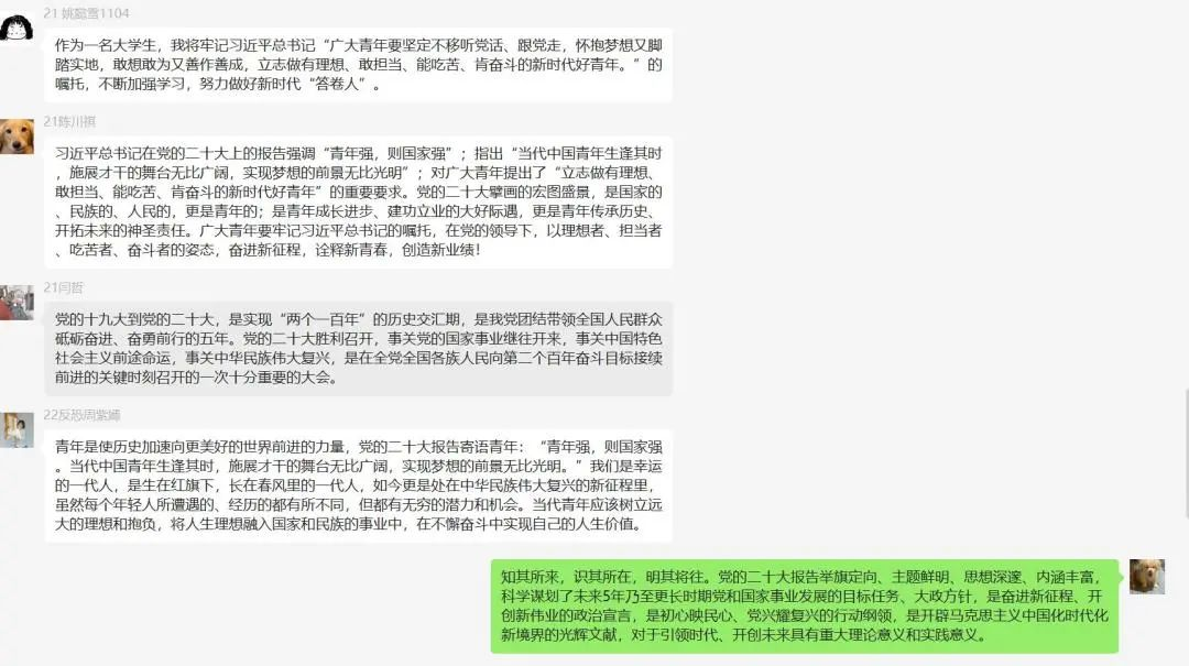 《习近平的七年知青岁月》读书会组织线上会议并对习近平总书记在党的二十大报告中的内容进行深刻的学习与探讨,习近平总书记在党的二十大报告中指出“当代中国青年生逢其时,施展才干的舞台无比广阔,实现梦想的前景无比光明”;对广大青年提出了“立志做有理想、敢担当、能吃苦、肯奋斗的新时代好青年”的重要要求。广大青年要牢记习近平总书记的嘱托,在党的领导下,以理想者、担当者、吃苦者、奋斗者的姿态,奋进新征程,诠释新青春,创造新业绩!