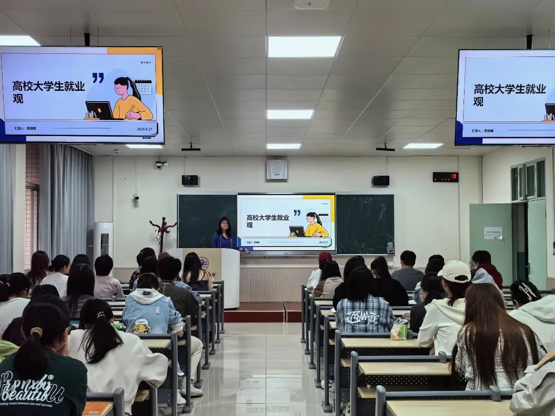 在宣讲中,董婧媛同学从高校大学生的就业观念现状入手,介绍了当前就业观念的多样性,分析了大学生就业观念转变和影响因素,让大家深刻明白了更新就业观念、确立积极就业态度的重要性。同时,董婧媛提出了树立正确就业观的建议:要结合自身情况,从实际出发选择职业和工作岗位;要不断增强个人能力、提高综合素质,主动掌握就业信息。