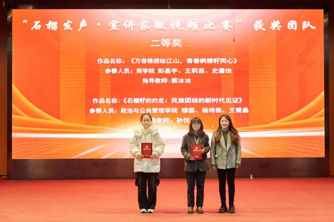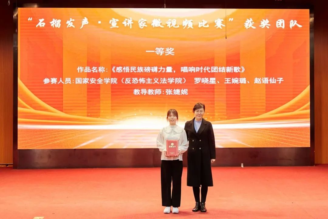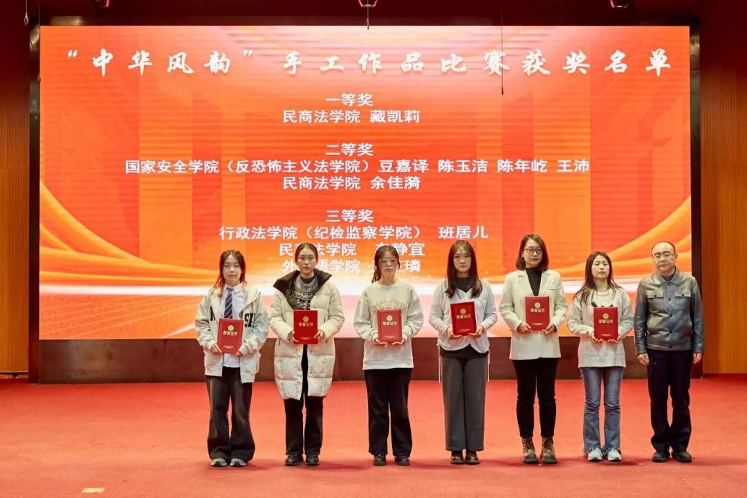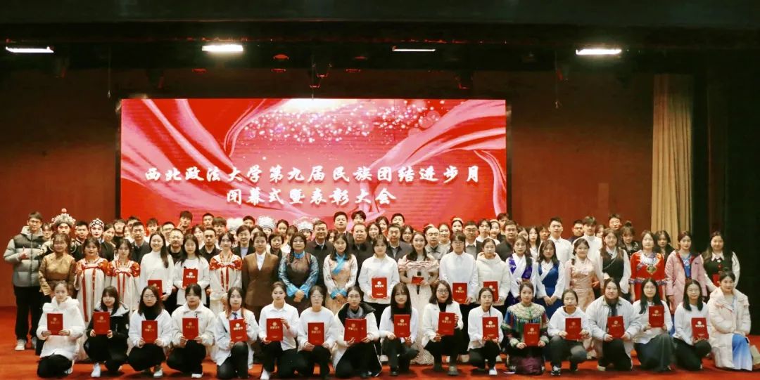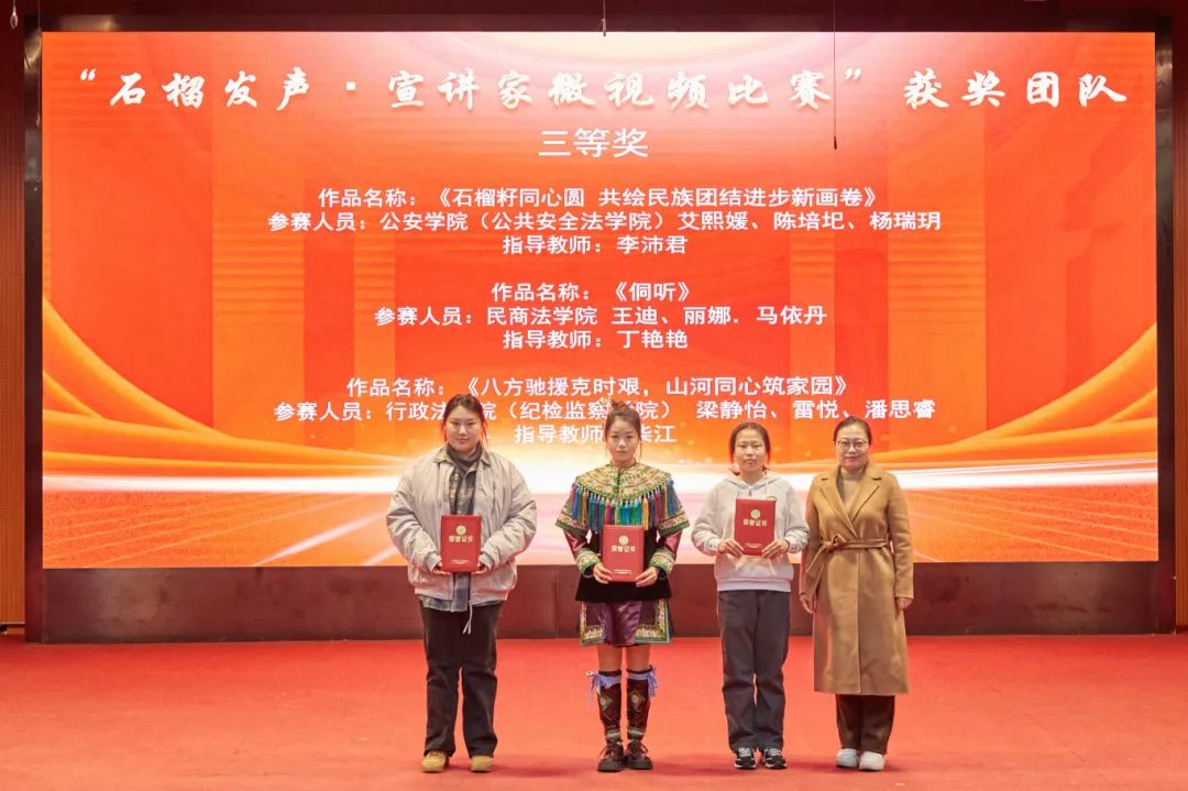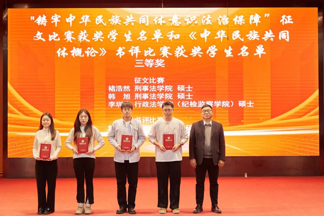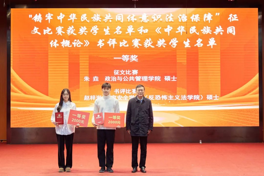 大会分别对“中华风韵”手工作品制作大赛、“56个民族,56朵花”海报作品制作大赛、“石榴发声·宣讲家”微视频、“铸牢中华民族共同体意识法治保障”征文比赛和《中华民族共同体概论》书评比赛、“铸牢中华民族共同体意识调研宣讲边疆行”暑期“三下乡”社会实践活动、“动画疯 弘志奖学金”获奖师生进行表彰并颁奖。