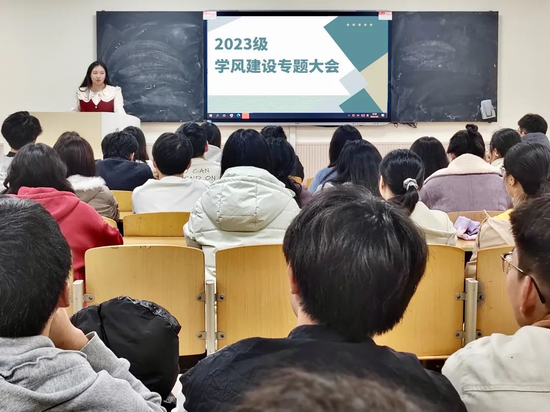 张婕妮在大会上指出,建设良好学风是培育扎实专业素养的关键举措,通过课堂考勤管理等机制,有助于同学们克服拖延惰性,建立系统性知识框架。她强调,各班干部应充分发挥带头作用,带领全班同学共同提升课堂“三率”。此外,张婕妮特别呼吁同学们在课堂上放下手机,抵御碎片化信息干扰,养成专心听讲的好习惯。这不仅是遵守课堂纪律的基本要求,更是建设优良学风的重要一环。