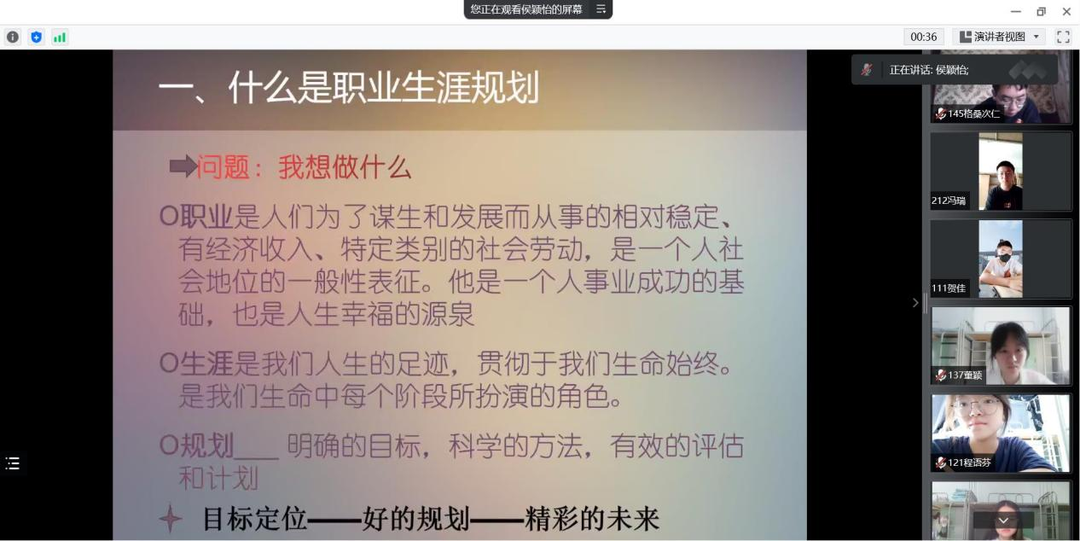 会议伊始,侯颖怡老师向同学们阐述了不同人生阶段的生活状态和树立人生目标的重要性,她告诫同学们要不忘初心,在人生最为关键的时刻确立目标,努力奋斗。其次,侯老师分别从“职业”“生涯”“规划”三个词的定义入手向同学们具体阐释了职业生涯规划的内涵,并强调了科学的目标定位和规划对于未来的重要性。她强调:大学的任务是立志和成才,并反复提醒大家机会只留给有准备的人,越早规划并为之努力的人,将会抓住更多的机会。再次,侯颖怡老师为2022级新生们分析了当前大学生就业形势和近年来我校毕业生就业情况,使同学们进一步明确了做好职业生涯规划的重要性。最后,侯颖怡老师从“四个环节”和“三大能力培养”的角度为同学们介绍了做好职业生涯规划的方式方法。“四个环节”即读书、听课、研究和运用;“三大能力培养”即培养自学能力、培养扎实技能和培养综合能力,从而引导学生科学地进行自我规划和管理。