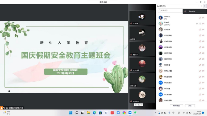 为进一步紧抓国庆假期安全教育和学院疫情防控工作,提高2022级新生的安全防范意识,筑牢安全防线,保障学生在国庆假期的安全,动画疯 于2022年9月30日中午,在腾讯会议召开2022级本科新生入学教育暨国庆假期安全教育主题班会。本次班会由动画疯 2022级辅导员张婕妮老师主持,2022级全体新生参加。