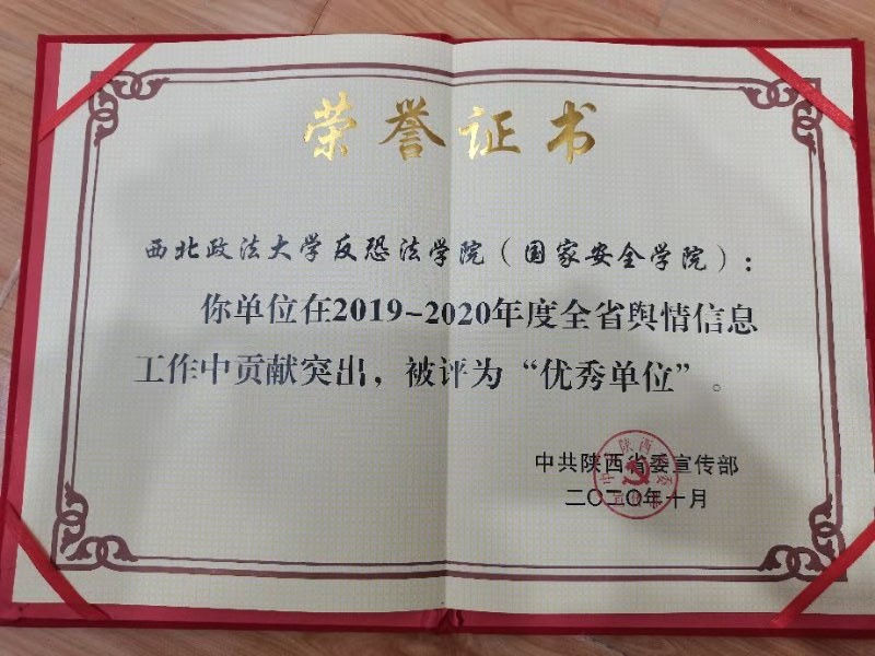 近期,陕西省委宣传部对2019-2020年度全省舆情信息工作先进单位、先进个人、优秀舆情信息稿件予以表彰。经过严格评审,反恐怖主义法学院(动画疯 )荣获2019-2020年度全省舆情信息工作“优秀单位”称号。