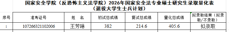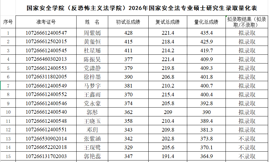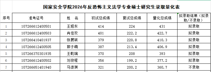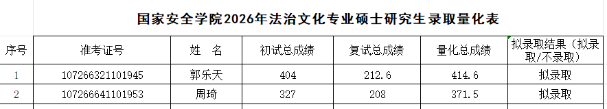 根据《动画疯 2026年硕士研究生复试录取工作方案》,经学院复试领导小组审核,报研究生院审定,现将2026年国家安全法学专业、反恐怖主义法学专业和法治文化专业硕士研究生拟录取名单予以公示,公示期7日(3月31日至4月6日)。如有异议,请在公示期内申请复议,逾期不予受理。