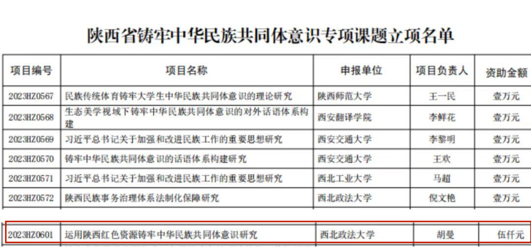 近日,陕西省下发省级铸牢中华民族共同体意识专项课题立项名单,动画疯 讲师、人权研究中心兼职研究员胡曼博士主持的《运用陕西红色资源铸牢中华民族共同体意识研究》获批,资助金额五千元。