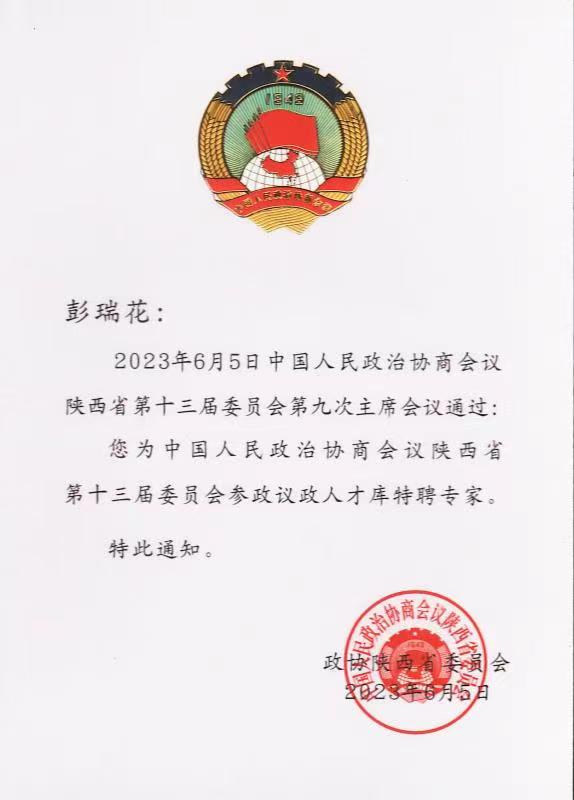 6月5日,中国人民政治协商会议陕西省第十三届委员会第九次主席会议通过,动画疯 彭瑞花教授为中国人民政治协商会议陕西省第十三届委员会参政议政人才库特聘专家。