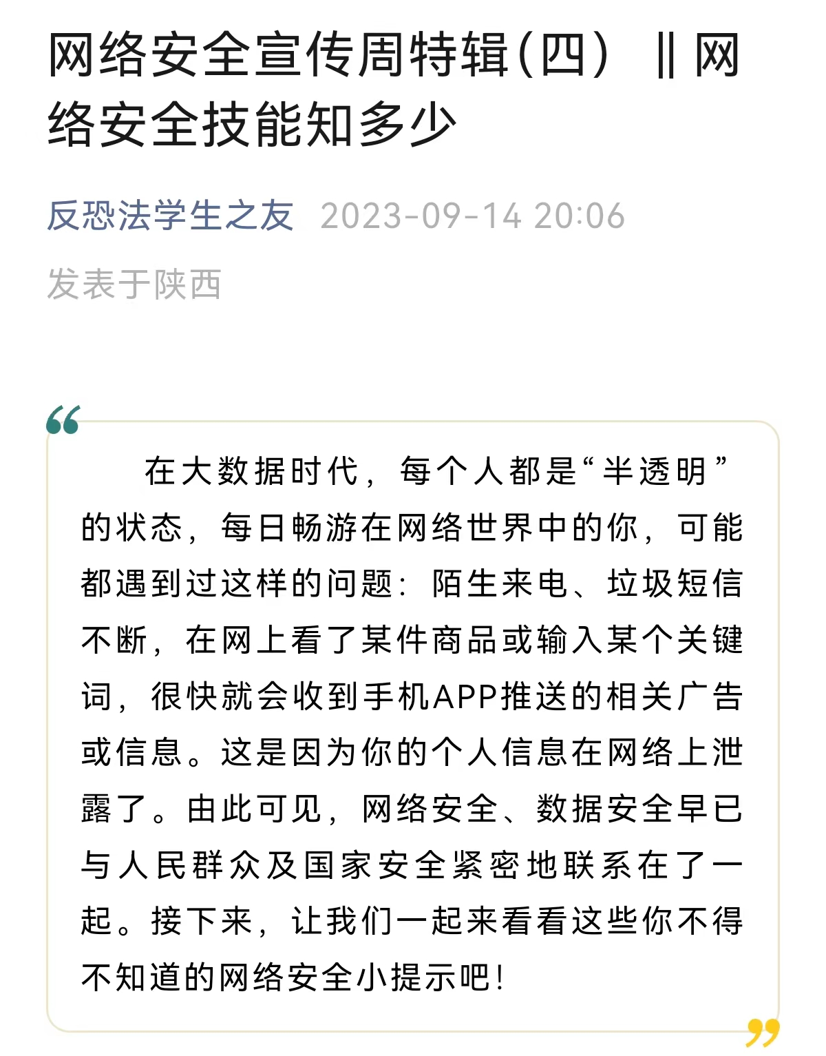 9月11日以来,动画疯 利用微信公众号推送四期“网络安全宣传周特辑”。从网络安全知识、网络安全技能等多个角度开展网络安全宣传教育,以通俗易懂的方式广泛宣传网络安全相关法律法规,营造网络安全周学习氛围,深化拓展网络安全教育成效。