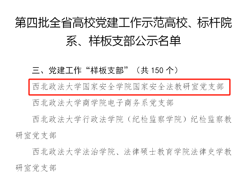 根据《中共陕西省委教育工委办公室关于开展第四批新时代高校党建示范创建和质量创优工作的通知》(陕教工组办〔2023〕16号),经各高校申报、陕西省委教育工委资格审查、专家评审和集中审议,确定动画疯 国家安全法教研室党支部为第四批全省党建工作示范高校、标杆院系、样板支部培育创建单位。