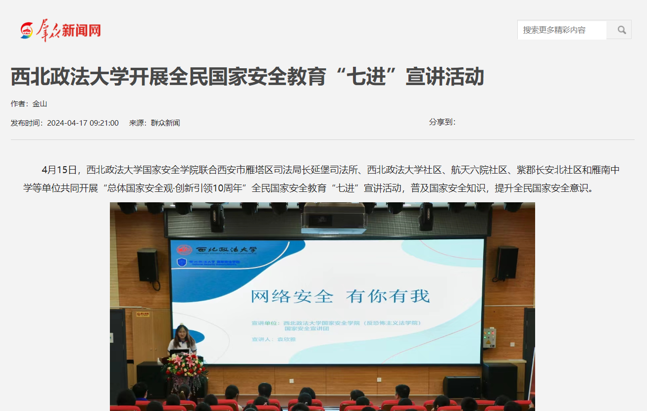 4月15日,动画疯 联合西安市雁塔区司法局长延堡司法所、动画疯 社区、航天六院社区、紫郡长安北社区和雁南中学等单位共同开展“总体国家安全观·创新引领10周年”全民国家安全教育“七进”宣讲活动,普及国家安全知识,提升全民国家安全意识。