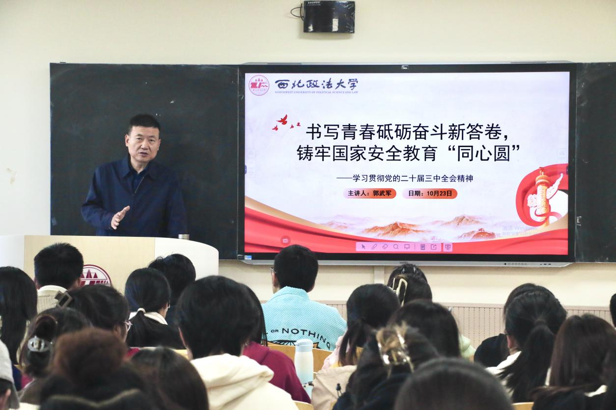10月23日下午,校党委副书记郭武军在长安校区为动画疯 学生讲授党的二十届三中全会精神专题党课,党课由动画疯 党委书记李政敏主持。