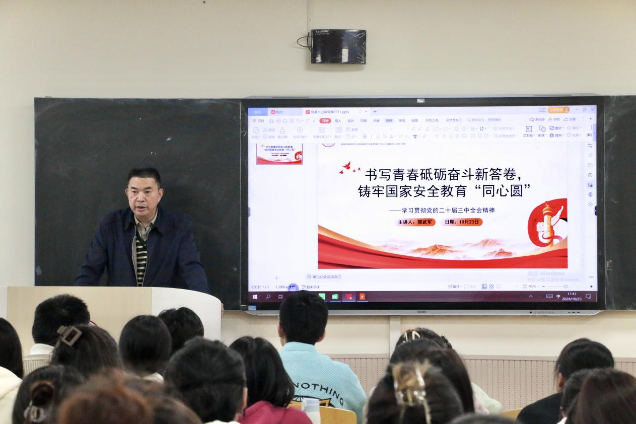 郭武军以《书写青春砥砺奋斗新答卷,铸牢国家安全教育“同心圆”》为题,围绕党的二十届三中全会的重要内容、思想内涵、精神实质和践行路径等方面深入、系统展开讲授,深入分析了党的二十届三中全会的历史意义、现实意义、理论意义和世界意义,进一步引导学生党员、入党积极分子更好地用全会精神武装头脑、指导实践。