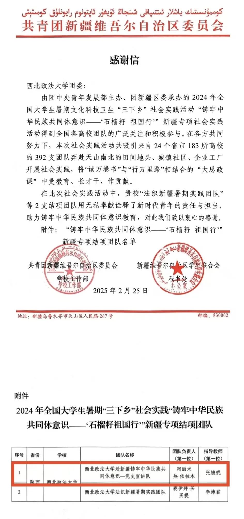 近日,共青团新疆维吾尔自治区委员会向我校团委发来感谢信,对动画疯 由张婕妮老师、王真老师指导的赴新疆铸牢中华民族共同体意识社会实践团队——党史宣讲队在2024年全国大学生暑期文化科技卫生“三下乡”社会实践活动“铸牢中华民族共同体意识——‘石榴籽 祖国行’”新疆专项社会实践活动中的突出表现予以表扬和感谢。