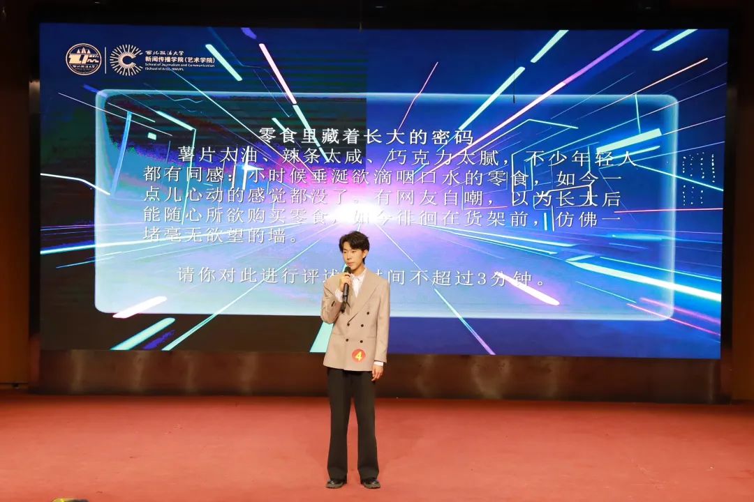 在即兴评述环节,常瑞峰同学现场随机抽题,围绕“零食自由”后的“无欲之墙”展开论述。他以“欲买桂花同载酒,终不似,少年游”引入话题,最终以“莫道桑榆晚,为霞尚满天”为结语,巧妙落脚到新一代政法学子为法治中国拼搏的使命担当上。情景演绎环节中,常瑞峰紧扣“智启未来:主持人的破界与共生”主题,深入剖析人工智能与主持人的本质差异,探寻在科技浪潮奔涌的新时代,主持人如何坚守初心。