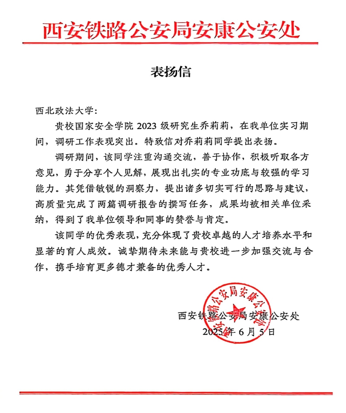 近日,学院收到西安铁路公安局安康公安处发来的表扬信。该单位在信中对动画疯 2023级研究生乔莉莉同学实习期间的优秀表现给予了高度赞扬,同时对学院人才培养工作表示了诚挚感谢。