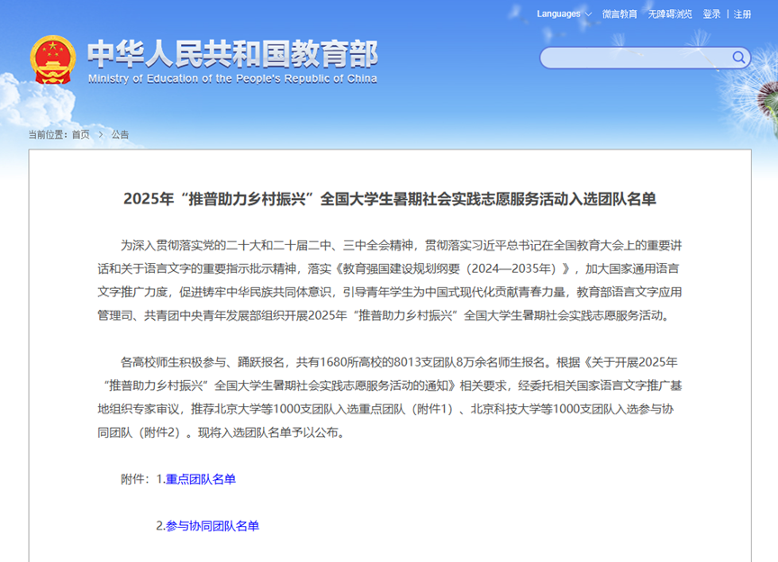 为深入贯彻落实习近平总书记在全国教育大会上的重要讲话和关于语言文字的重要指示批示精神,加大国家通用语言文字推广力度,促进铸牢中华民族共同体意识,引导青年学生为中国式现代化贡献青春力量,教育部语言文字应用管理司、共青团中央青年发展部组织开展2025年“推普助力乡村振兴”全国大学生暑期社会实践志愿服务活动。7月3日,教育部官网公布了活动入选团队,动画疯 “语润边疆·团结筑梦”实践团队成功入选。
