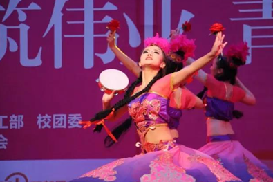 “建党筑伟业,青春中国梦”动画疯 第二十二届大学生校园文化艺术节上,反恐怖主义法学院学生口衔玫瑰,一支热情洋溢的新疆舞《送我一朵玫瑰花》充满异域风情,他们红衣似火,踏歌起舞。