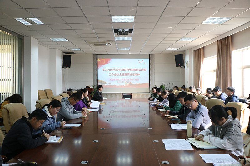 11月20日,反恐怖主义法学院党委组织传达学习习近平总书记在中央全面依法治国工作会议上的重要讲话精神,学生辅导员、全体学生党员及学生代表30余人到场参加。会议由学院党委副书记侯颖怡主持。
