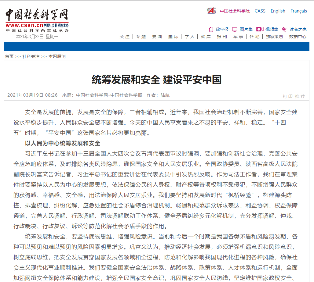 安全是发展的前提,发展是安全的保障,二者相辅相成。近年来,我国社会治理机制不断完善,国家安全建设水平稳步提升,人民群众安全感不断增强。今天的中国人民享受着来之不易的平安、祥和、稳定。“十四五”时期,“平安中国”这张国家名片必将更加亮丽。