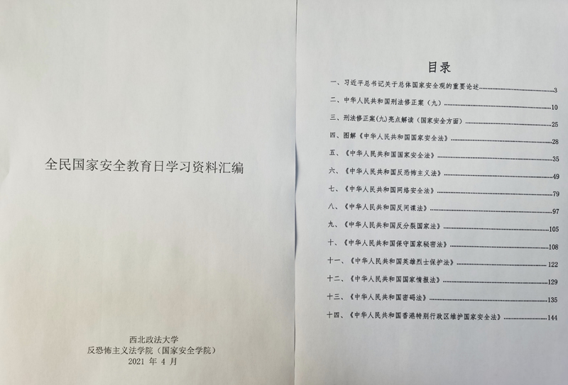 学院党委组织编写《全民国家安全教育日学习资料汇编》,在历年资料汇编的基础上,增加《中华人民共和国英雄烈士保护法》《中华人民共和国国家情报法》《中华人民共和国香港特别行政区维护国家安全法》等法律法规,印发师生学习;组织学生参加“三秦高校4.15安全知识竞赛”线上答题、参加教育部“千万师生同上一堂国家安全教育课”,通过竞赛答题和理论学习帮助学生了解国家安全知识;制作国家安全宣传视频,利用微信公众号、学院网站进行广泛宣传,深入推进国家安全意识入脑入心。