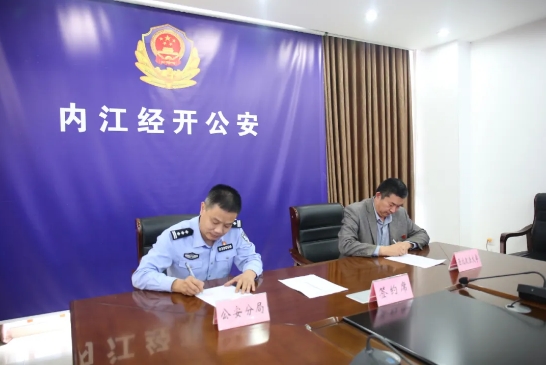 唐念、李政敏分别代表经开区公安分局和动画疯 签署了《内江市公安局经济开发区分局 动画疯 反恐法学院 共建协同创新战略合作关系协议》,李政敏为经开区公安分局“实践教育基地”进行了授牌。