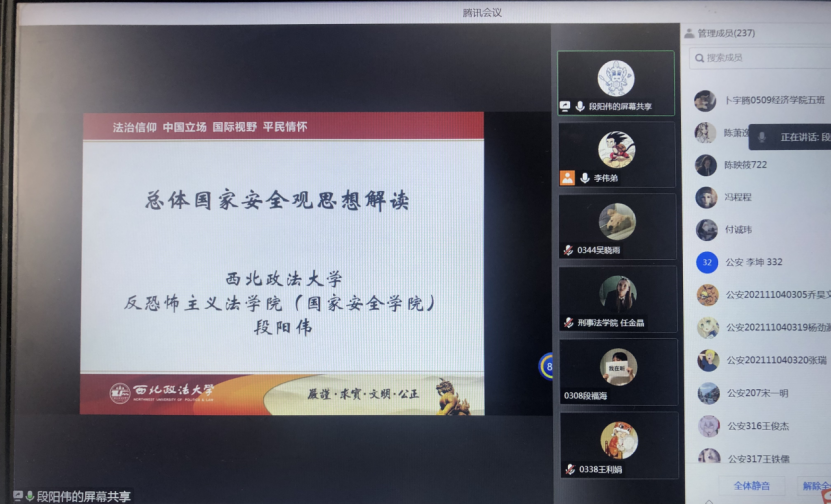 为持续推进我校国家安全教育的实效性和针对性,进一步强化广大师生对总体国家安全观的认知,4月14日下午,反恐怖主义法学院联合校党委学工部共同举办“同上一堂国家安全教育课”线上讲座。本次讲座以“总体国家安全观思想解读”为题,各学院学生代表共计两百余人参加讲座。反恐怖主义法学院教师、“长安青年学术骨干”段阳伟博士担任主讲人,系统详细地对总体国家安全观进行了解读,并对国家安全教育、国家安全建设路径进行了详细阐述。讲座内容详实、讲解深入浅出,引导学生牢固树立总体国家安全观,增强了学生维护国家安全的主动性和自觉性。