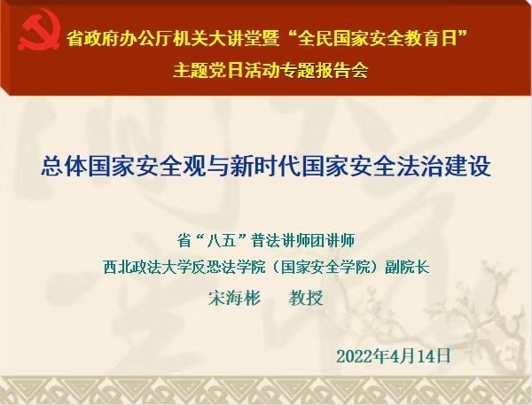 面向党政机关国家安全工作需要,学院选派专业课教师深入党政机关开展国家安全宣讲活动。4月14日,副院长宋海彬教授应邀在陕西省政府办公厅机关大讲堂暨“全民国家安全教育日”主题党日活动中作专题报告。宋海彬教授从“建国以来中国共产党国家安全观的历史演进”“总体国家安全观确立的时代背景与历史方位”“新时代国家安全工作的历史性变革”“进一步完善国家安全法律规范体系建设”“大力推进国家安全法治实施体系建设”五个方面阐述了总体国家安全观与新时代的国家安全法治建设。