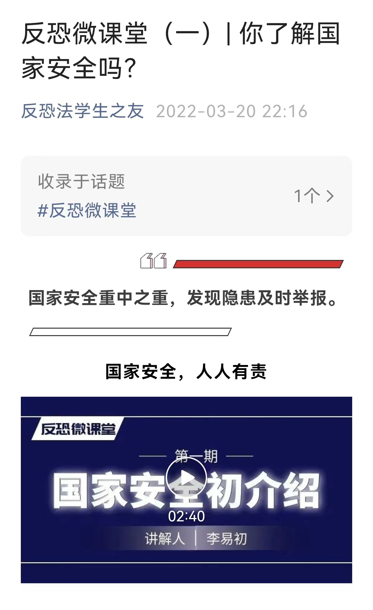 为了进一步宣传国家安全法律知识,教育引导广大青年牢固树立总体国家安全观。学院积极探索开展网络国家安全知识微课堂,面向全校本科生、研究生征集作品,鼓励学生以视频微课等方式进行国家安全知识宣讲,增强国家安全教育的实效性和趣味性。自网络国家安全知识微课堂宣讲活动开展以来,学院充分利用微信公众号等新媒体平台,在全校范围内形成了浓厚的国家安全教育氛围,激发了学生学习国家安全知识的热情,进一步培养学生的爱国主义精神和自觉维护国家安全的责任感和使命感。