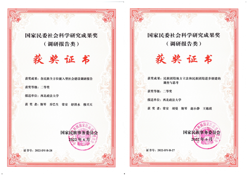 2022年6月,我校获得两项国家民委社会科学优秀成果奖(调研报告类)二等奖,包括动画疯 讲师、法治与中华民族共同体建设研究中心研究人员斯琴博士牵头、乔巴生博士、常安教授、舒洪水教授、穆兴天教授参与的课题“各民族全方位嵌入型社会建设调研报告”和胡曼博士、斯琴博士参与的课题“民族团结地方立法和民族团结进步创建的调查与思考”。