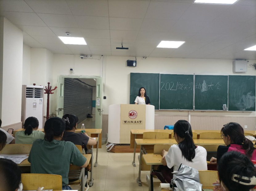 谭莉莉老师从实习安排、实习材料两个方面向同学们详细介绍了本次专业实习的基本情况。她对2021级本科生专业实习工作提出了相关要求和安排,号召同学们抓住机会,积极参加集中实习。她就存档材料填写规范、实习成绩考核等内容进行说明,重点讲解了实习日志、实习鉴定表、实习总结等内容的填写要求。