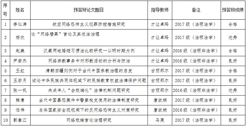 第二组答辩组长为古丽那尔(副教授),答辩委员有彭瑞花(副教授)、何杰锋(讲师)、才让卓玛(讲师)、马亮(讲师),答辩秘书为王卓(民族宗教研究院秘书长)、申苗苗(2017级民族法专业研究生)。本组答辩共有学生10人,其中包括2016级民族法专业学生3人、2016级法律硕士(非法学)专业学生2人、2017级法律硕士(法学)专业学生4人。